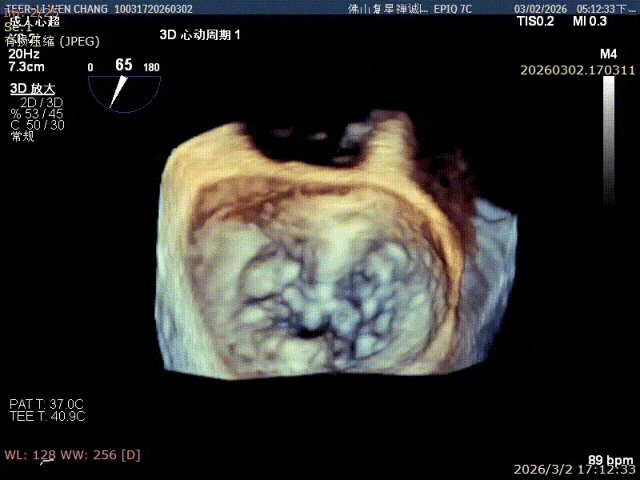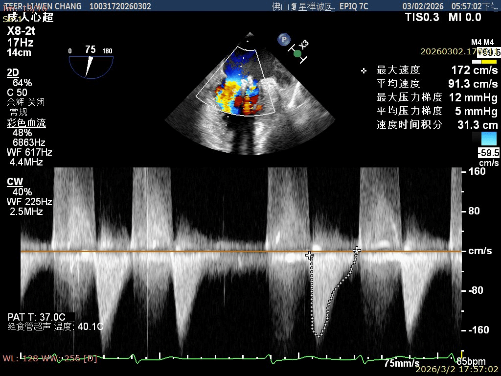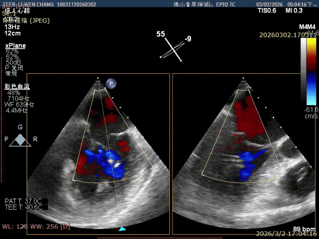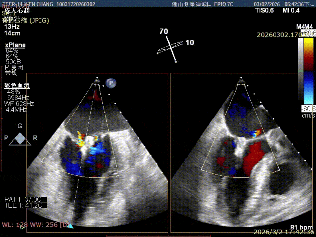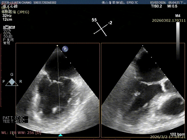 彭宇程教授团队行房间隔穿刺,高度4.3cm,依次置入导引鞘和XW0612瓣膜夹,瓣上精准调整测试瓣膜夹Position、Orientation、Trajectory,跨瓣后打开瓣膜夹捕捞,确认前后瓣叶平铺在夹臂上,Gripper down后,慢慢关闭瓣膜夹夹臂,释放前后都进行评估,确认夹子内外两侧仍存在少量反流,决定在第一枚夹子外侧补放一枚SN0409瓣膜夹,瓣膜夹捕获瓣叶后,评估剩余瓣口面积,跨瓣压差,残余反流,取得优秀的效果,决定释放;术后即刻评估显示二尖瓣反流得到显著控制,跨瓣压差约5mmHg,肺静脉逆流征象明显改善,血流动力学效果优异。